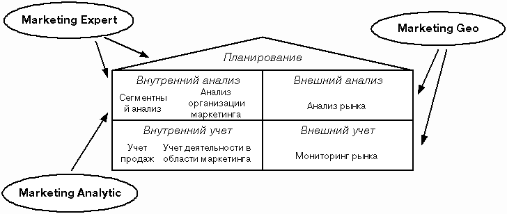Ядром полномасштабной информационно-аналитической системы маркетинга, удовлетворяющей перечисленным выше требованиям, может служить информационно-аналитический комплекс, в который входят программы Marketing Analytic, Marketing GEO и Marketing Expert, поддерживающие широкий обмен данными между собой, а также с учетной системой предприятия. Структура информационно-аналитической системы маркетинга представлена на рис.1.