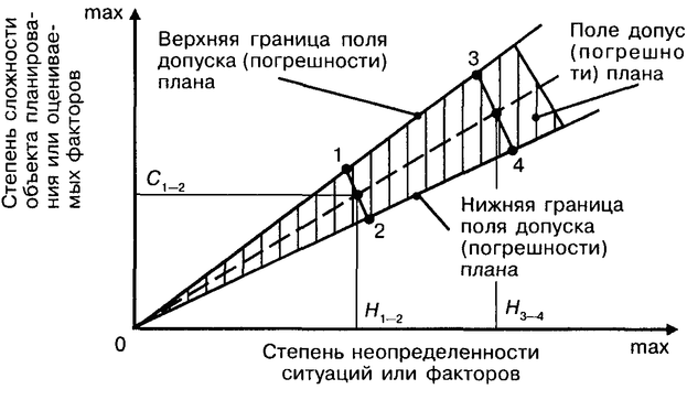 прямо пропорционально увеличивается поле допуска или погрешности параметров плана. С повышением степени сложности объекта планирования поле допуска тоже увеличивается (отрезок 1—2 < отрезка 3—4, а Н1_2 < Н3_4). Для уменьшения степени неопределенности ситуаций следует шире применять научные подходы и принципы планирования. Для уменьшения степени сложности объекта планирования необходимо при его проектировании использовать принцип блочности, применять в проекте (конструкции) ранее отработанные проектные решения.