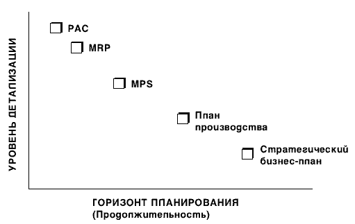 На рис. 3.3 отображено соотношение между различными средствами планирования, горизонтами планирования и уровнями детализации.