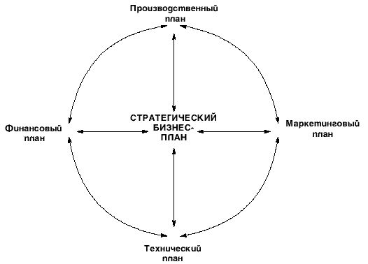 Разработка стратегического бизнес-плана входит в обязанности руководства предприятия. На основе полученной от отделов маркетинга, финансов и производства информации стратегический бизнес-план определяет общую схему, в соответствии с которой ставятся цели и задачи дальнейшего планирования в маркетинговом, финансовом, техническом и производственном отделах. Каждый отдел разрабатывает свой план выполнения поставленных стратегическим бизнес-планом задач . Эти планы согласовываются между собой, а также со стратегическим бизнес-планом. Это соотношение проиллюстрировано на рис. 3.2.