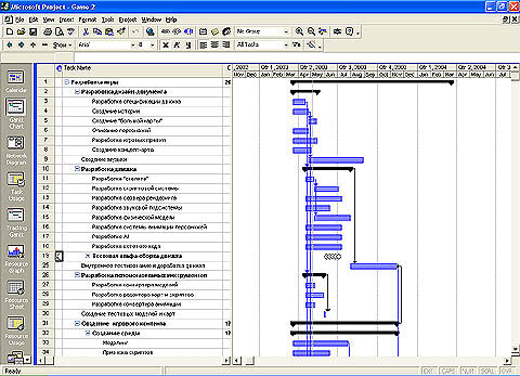 Если все же попытаться описать Microsoft Project, основываясь на аналогии с другими продуктами Microsoft, наиболее близкими его "родственниками" окажутся MS Excel и MS Access. Действительно, весь проект описывается в специальной базе данных, в которой содержатся сроки выполнения, характеристики работ, ресурсов, темпы расходования ресурсов задачами и прочие элементы проекта. Соответственно, ввод информации о проекте (работы, ресурсы и их свойства) осуществляется, в основном, в табличной форме, что роднит MS Project с электронными таблицами и базами данных. Однако на этом сходство и заканчивается. "Узкая специализация" MS Project обусловливает наличие в нем множество встроенных режимов отображения проектной информации. При этом упомянутое табличное отображение работ (диаграмма Гантта) - лишь один из этих режимов. Поскольку именно в режиме диаграммы Гантта создается ядро описания проекта, с него и начнем.