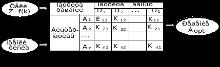 По прогнозируемым пакетам данных D могут быть рассчитаны для альтернативных решений А прогнозируемые результаты К. Далее с учетом возможности риска выбирается альтернатива Aopt, которая наилучшим образом соответствует цели А.