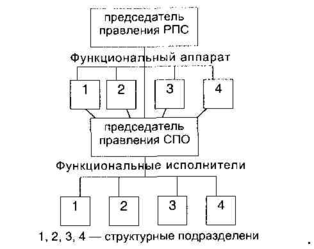 Достоинством данного типа является специализация работ, что способствует повышению качества принимаемых решений. Недостаток — многоначалие и возможная противоречивость указаний. Наиболее распространенным является комбинированный тип (.линейно-функциональный), сочетающий прямое линейное подчинение с функциональным. Он признается более рациональным при условии исключения дублирования и несогласованности между различными отделами и исполнителями (рис. 7).