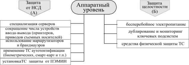 На аппаратном уровне (защита ТС обработки информации и технические средства защиты) (см. рис. 19) осуществляется: