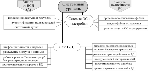 На системном уровне (средства защиты сетевых операционных систем и СУБД, администраторские надстройки над ними) (см. рис. 20) осуществляется: