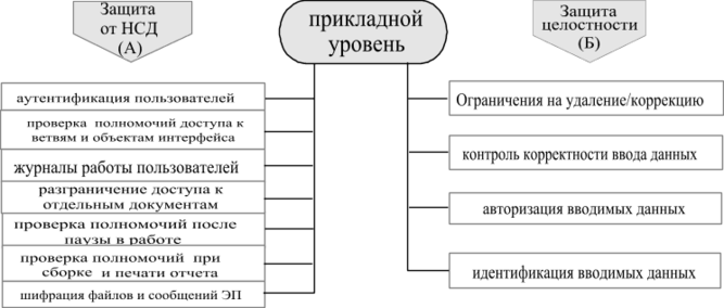 На прикладном уровне (инструментальное ПО приложений, пользовательские интерфейсы, индивидуальное защитное ПО) (см. рис. 21) осуществляется:
