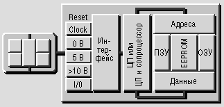 Микропроцессорные карты включают в себя процессор, постоянное и оперативное запоминающие устройства, файловую операционную систему, способную работать с различными приложениями. Основой внутренней организации смарт-карты является так называемая SPOM-архитектура (Self Programming One-chip Memory), предусматривающая наличие центрального процессора (CPU), ОЗУ, ПЗУ и электрически перепрограммируемой постоянной памяти EEPROM (рис.24). Как правило, в карте также присутствует специализированный сопроцессор.