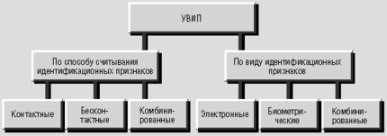 В состав аппаратных средств УВИП входят идентификаторы и считывающие устройства (иногда считыватели могут отсутствовать). Современные УВИП принято классифицировать по виду идентификационных признаков и по способу их считывания (рис. 23).