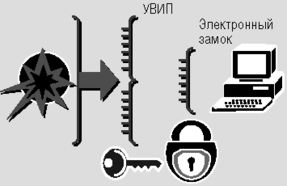 К аппаратно-программным системам контроля доступа к компонентам КС относятся электронные замки, устройства ввода идентификационных признаков (УВИП) и соответствующее ПО. Совместное применение УВИП и электронного замка дает возможность воздвигнуть перед злоумышленником две линии обороны (рис. 22).