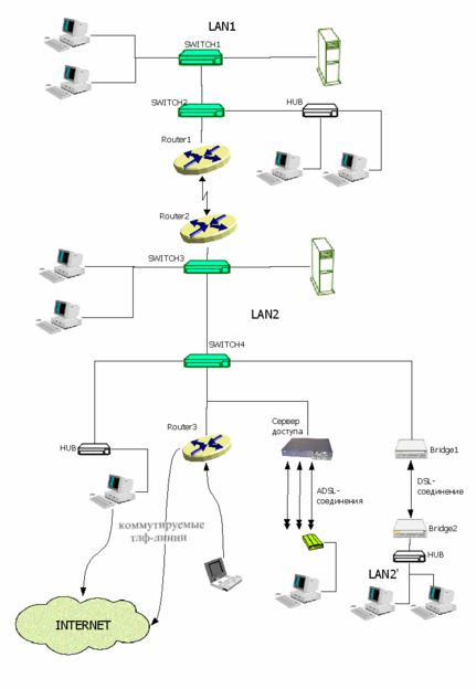 Необходимость объединения территориально удаленных сегментов (локальных подсетей) в корпоративную сеть привела к использованию мостов (bridge) и маршрутизаторов (router). Маршрутизаторы используются также для управления доступом в локальную сеть с удаленных рабочих мест и из локальной сети – в Интернет. Пример построения гетерогенной корпоративной сети с различными вариантами сетевых соединений и коммутационных устройств изображен на рисунке 34. Данная сеть состоит из двух локальных сетей (LAN1 и LAN2), объединенных с помощью маршрутизаторов (router1 и router2). LAN2 состоит из двух сегментов, связанных по выделенной телефонной линии с помощью DSL-модемов, выступающих в роли мостов (bridge1 и bridge2). Кроме того, к LAN2 могут присоединяться удаленные рабочие места через сервер доступа по каналам ADSL и через router3 по телефонным каналам. Рабочие станции в LAN2 имеют выход в Интернет.