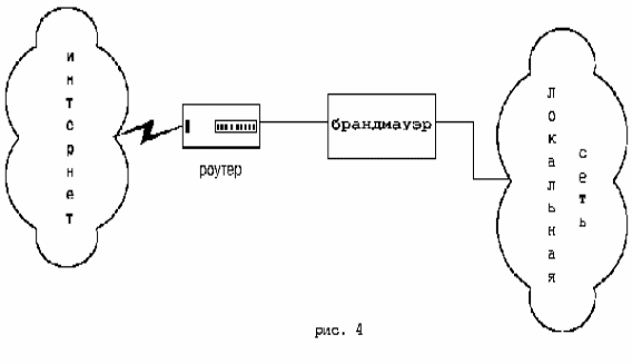 Наиболее часто встречающаяся и простая схема включения брандмауэра заключается его установке между внешним маршрутизатором и внутренней сетью (рис. 50).