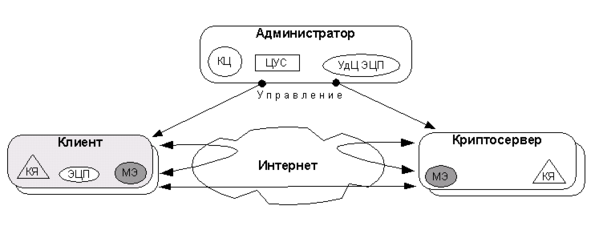 -Ключевой Центр (КЦ) - предназначен для обеспечения ключевой информацией всех участников VPN и выполнения функций удостоверяющего центра. При этом первичные клиентские ключевые наборы могут быть записаны на дискеты, смарт-карты, touch memory, e-token и прочее для передачи участникам VPN. Последующее обновление ключевой информации осуществляется автоматически по защищенным каналам VPN.
