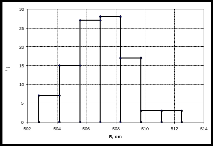 Подсчитывают частоты mi, (i=1…k), равные числам попаданий величины x в соответствующие интервалы [xi, xi+1). Значения x, попавшие на границу между i-м и (i+1)-м интервалами, относят к i-му интервалу. Значение xmax относят к последнему интервалу. Очевидно, что сумма всех частот равна общему объему выборки: