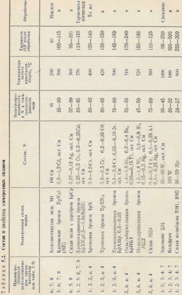 Для легирования применяют в основном Сd, Сr, Аg, Со, Ni. Температуру рекристаллизации и твердость дополнительно повышают малыми добавками Тi, Be, Zr, Аl, В, Si. С увеличением содержания легирующих элементов уменьшается электропроводимость к и теплопроводность меди. Поэтому суммарное количество легирующих элементов обычно не превышает 2 %. основные свойства электродных материалов приведены в табл. 5.2.