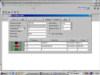 Анализ частотных характеристик начинается по команде Analysis>AC. В открывшемся окне задания на расчет – см.рис.2 указывается диапазон частот (Frequency Range) и имена переменных, графики которых надо построить. Р - номер графика, Х- Expression переменная, откладываемая по оси Х, Y-Expression, переменная, откладываемая по оси Y, PH -график фазовой характеристики и т.д. Например, на рис.2 указано, что на первом графике необходимо построить частотную характеристику, т.е. модуль отношения напряжений V(9)/V(2) в узлах 9 и 2 схемы, на втором графике–частотно-фазовую характеристику ( разность фаз напряжений между этими узлами). Графики должны быть построены в диапазоне частот: 100 МГц-10 кГц.-Frequency Range10E8,10k. Следует обратить внимание, что при задании диапазона частот, так же как и интервала изменения любых других величин, сначала указывается максимальное значение, а затем минимальное, которые разделяются запятыми в латинском регистре. Минимальное значение в частности может быть равно нулю. На рис.2 в опции Temperature указано, что исследование проводится при температуре равной 270C. Полезно включить опцию автоматического масштабирования графиков-Auto Scale Range. Количество точек графика (Number of Points) определяет точность его построения. Целесообразно задать эту величину равной 100-500/ В левой части рис.2 указаны логарифмический масштаб по оси абсцисс и линейный по оси ординат. Приведен также желаемый цвет графиков частотных характеристик- черный и красный для АЧХ и ФЧХ.. Для выполнения моделирования необходимо нажать кнопку Run или клавишу F8.