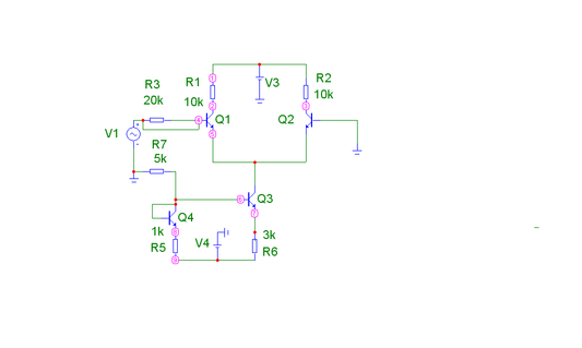 Исключите из схемы правый источник сигнала V2, сохранив левый источник V1- Рис.4а.. В этом случае, как известно- см. [5. ч.1. c.120-129]- дифференциальный каскад возбуждается по обоим плечам синфазными и дифференциальными сигналами одинаковой величины. На левом плече ДК фазы (полярности) синфазной и дифференциальной компоненты входного сигнала совпадают, а на правом плече будут противоположны. Синфазная компонента существенно подавляется каскадом. Дифференциальные компоненты входного сигнала усиливаются обоими плечами ДК. Поскольку в этом случае базы транзисторов Q1 и Q2 соединены с общим проводом, то при анализе достаточно провести исследование величин напряжения сигналов ,например, в узлах 2 и 3 схемы рис.4.а.