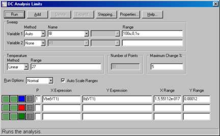 Учтите, что заданное таким образом максимальное значение тока источника не обязательно должно совпадать со значением, указанным в атрибутах источника при составлении схемы. В нижней части окна указываются имена переменных, откладываемых по горизонтальной (X Expression) и вертикальной (Y Expression) осям графика. Для графика входной характеристики это соответственно напряжение между базой и эмиттером V(BE)и ток базы Ib транзистора VT1. Для автоматического масштабирования графика по осям координат включите опцию Auto Scale Ranges. Нажатием на кнопку Ran выполните моделирование и проанализируйте полученную характеристику.