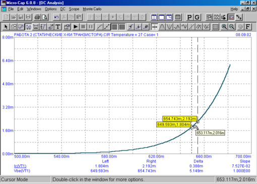 Для этого на графике проходной характеристики поместите два электронных маркера симметрично относительно рабочей точки как можно ближе к ней – один слева, а другой справа (рис.0.2.3). При этом в нижней части графика будут указаны значения кординаты маркеров (под заголовком Left – для левого маркера и Right – для правого); отношения разностей координат (под заголовком Slope – «Наклон»). Таким образом, на графике проходной характеристики под заголовком Slope будет указано приближённое значение крутизны транзистора. Выразите измеренное значение крутизны в миллисименсах (мСм). Выполните расчёт и построение графика зависимости крутизны от управляющего напряжения. Для этого в окне задания параметров в качестве величины, откладываемой по вертикальной оси графика, (Y Expression) укажите отношение приращения тока IК к приращению напряжения UБЭ: del(IC(VT1))/del(VBE(VT1)). Выполните расчёт и построение графика зависимости крутизны от управляющего напряжения.