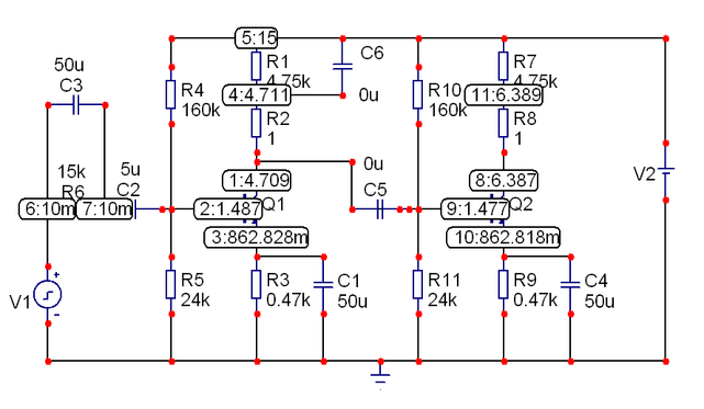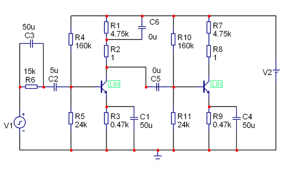 При этом необходимо подключить к выходу первого каскада вход второго каскада, введя емкость конденсатора С5=50 мкФ (С5=50U).