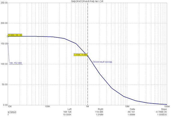 Таким образом, подключение второго каскада уменьшает как усиление в области средних частот, так и полосу пропускания (верхнюю граничную частоту).