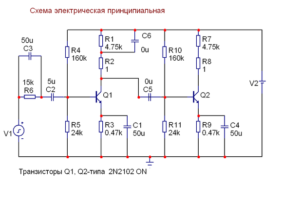 Q1, Q2 – биполярные транзисторы типа 2N2102 ON.