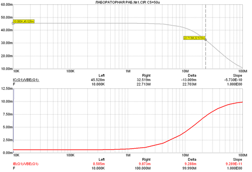 RB (сопротивление базы) – 100 Ом, Сопротивления коллектора и эмиттера RK=4.75 кОм, RЭ= 0.47 кОм. BF=h21=79.3546