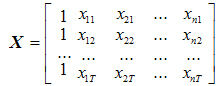 Исходными данными при оценке параметров a0 , a1 ,..., an является вектор значений зависимой переменной y = (y1 , y2 , ... , yT )' и матрица значений независимых переменных
