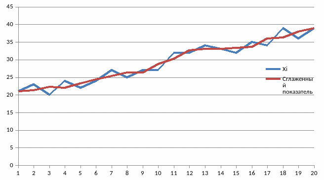 | Xi | Расчет скользящих средних | Сглаженный показатель | |