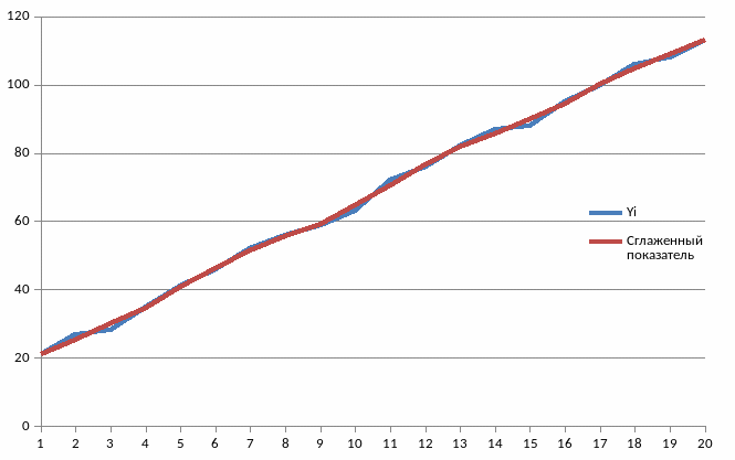 | Yi | Расчет скользящих средних | Сглаженный показатель | |