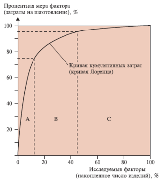 АВС-анализ основывается на принципе дисбаланса, при проведении которого строится график зависимости совокупного эффекта от количества элементов. Такой график называется кривой Парето, кривой Лоренца или ABC-кривой. По результатам анализа ассортиментные позиции ранжируются и группируются в зависимости от размера их вклада в совокупный эффект. В логистике ABC-анализ обычно применяют с целью отслеживания объёмов отгрузки определённых артикулов и частоты обращений к той или иной позиции ассортимента, а также для ранжирования клиентов по количеству или объёму сделанных ими заказов.
