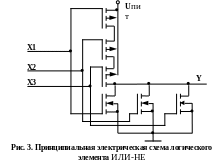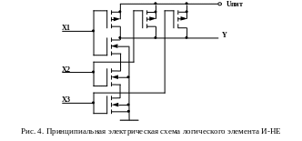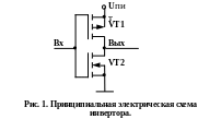 Базовыми логическими элементами в КМОП-схемотехнике являются инвертор; логические схемы И-НЕ, ИЛИ-НЕ; тактируемый двунаправленный ключ. Приведем их принципиальные схемы: