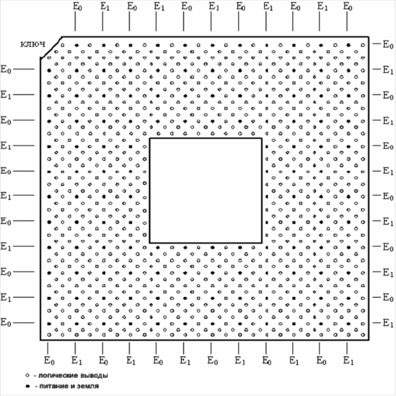 При таком расположении выводов площадь кристалла с отступом от слоев займет 181 вывод (10х10 + 9х9 выводов). Таким образом, при расчете габаритов корпуса как прямоугольной модели с равномерным расположением выводов, общее число контактов можно определить как 975 + 181 = 1166.