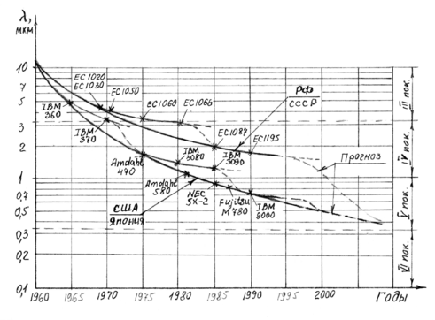 Развитие средств ВТ на основе ИС, БИС и СБИС происходит в ведущих фирмах различных стран с разными темпами: где-то более интенсивно (напр., фирмы США, Японии), где-то менее. Это связано с объемом капитальных вложений в вычислительную отрасль на соответствующих этапах ее развития. Пример тенденций развития поколений СВТ и уровня полупроводниковой технологии () в конструкциях ЭВМ ведущих отечественных и зарубежных фирм по годам в интервале от 1965г. примерно до 1995г. приведен на рис.2.