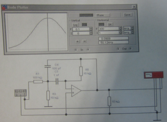 Схема и график АЧХ полученного полосового фильтра: