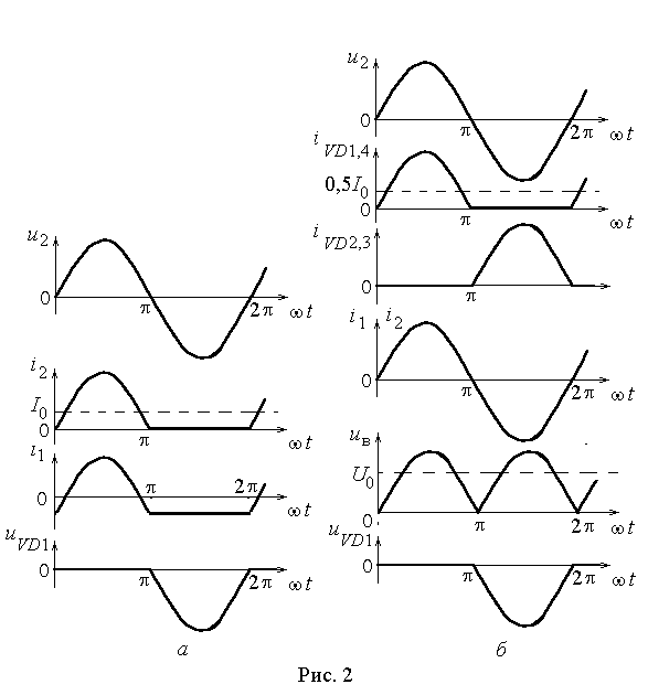 Временные диаграммы без учета потерь в элементах схемы для однофазной однотактной схемы выпрямления при работе на резистивную нагрузку приведены на рис. 2, а. Основные расчетные соотношения приведены далее:
