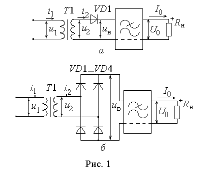 В источниках вторичного электропитания (ИВЭП) для радиоэлектронной аппаратуры наибольшее распространение получила однофазная двухтактная (мостовая) схема выпрямителя (рис. 1, б) как имеющая существенные преимущества перед простейшей однофазной однотактной (рис. 1, а).