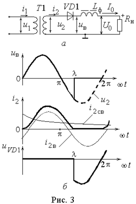 простейшей схеме однофазного однотактного (однополупериодного) выпрямителя (рис. 3, а) форма импульса тока вторичной обмотки, совпадающего с током диода (iv = i2), определяется алгебраической суммой вынужденной i2в и свободной i2св составляющих, полученных в результате решения уравнения u2 = Lфdi2/dt +