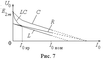 Аналогичные процессы наблюдаются в двухтактной схеме выпрямителя, а также в других схемах выпрямления (m ≥ 1) с емкостной нагрузкой, при этом отличие заключается лишь в периодичности процессов заряда и разряда конденсатора. Внешние характеристики выпрямителя при использовании различных сглаживающих фильтров представлены на рис. 7.