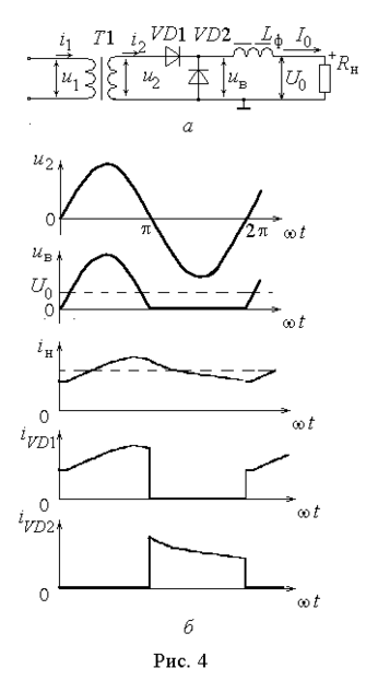 На практике чаще используется модификация рассмотренной схемы, отличающаяся наличием “обратного” диода (рис. 4, а), шунтирующего цепь нагрузки при появлении на выходе выпрямителя напряжения обратной полярности (ωt > π) и обеспечивающего “запирание” основного диода VD1 (рис. 3, б, рис. 4, б). Введение “обратного” диода VD2 создает разрядный контур, по которому замыкается ток нагрузки во втором полупериоде (π < ωt < 2π), поддерживаемый за счет энергии, накопленной в магнитном поле индуктивности Lф в течение первого полупериода (0 < ωt < π). При этом ток в нагрузке iн уже не может стать равным нулю ни в какой момент периода, что приводит к сглаживанию пульсаций тока в нагрузке.