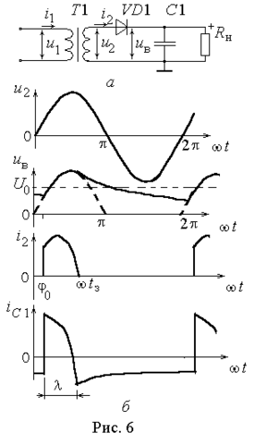 Режим работы на резистивно-емкостную нагрузку является наиболее распространенным в маломощных выпрямителях. В этом режиме параллельно сопротивлению нагрузки подключается конденсатор (рис. 6, а), что приводит к существенным изменениям форм тока диода и выпрямленного напряжения, а также энергетических соотношений.