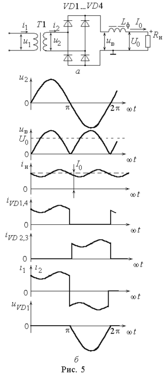 От указанных недостатков свободна двухтактная (мостовая) схема выпрямителя (рис. 5, а). Временные диаграммы токов и напряжений в характерных точках этой схемы показаны на рис. 5, б. Значение индуктивности Lф в данном случае определяет только уровень пульсаций напряжения на нагрузке и не влияет на его постоянную составляющую и интервал проводимости диодов, что характерно для всех схем с m ≥ 2. Основные расчетные соотношения для рассматриваемой схемы приведены далее: