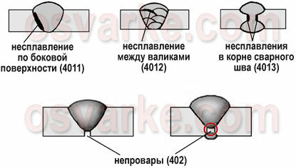 Несплавлением (401) называется отсутствие соединения между металлом шва и основным металлом либо между отдельными валиками сварного шва. Типы несплавлений: