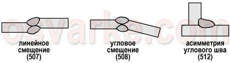 Смещение между свариваемыми элементами при их параллельном расположении на разном уровне называется линейным смещением, а при расположении кромок элементов под углом – угловым смещением. Чрезмерной асимметрией углового шва называется значительное превышение размеров одного катета над другим.