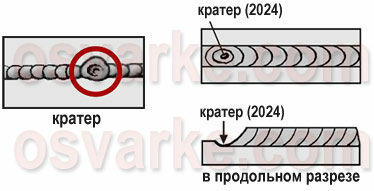 К полостям также относятся усадочные раковины (202, R) и кратеры (2024, K). Усадочная раковина (по ГОСТ 30242-97) – это полость, которая образуется вследствие усадки при затвердевании. Кратером называется незаваренная усадочная раковина в конце валика сварного шва.