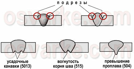 Подрезы – это продольные углубления на наружной поверхности валика шва. Подрезы со стороны корня одностороннего шва из-за усадки вдоль границы называются усадочными канавками. Превышение проплава – избыток наплавленного металла на обратной стороне стыкового сварного шва. Вогнутость корня шва – неглубокая канавка со стороны корня шва, возникшая из-за усадки.