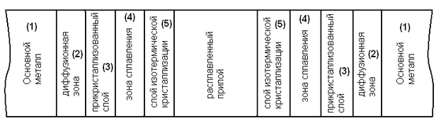 Слой изотермической кристаллизации (5) – прослойка постоянного состава, образующаяся при температуре пайки в результате выделения из расплава зоны сплавления на подложку твердой фазы.