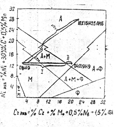 Проведение термообработки сварного соединения не всегда осуществимо, из-за больших размеров изделия и отсутствия печей таких габаритов. Выполнить местную термообработку нельзя, из-за того, что она может оказать неблагоприятное воздействие на свойства или напряженное состояние соседских зон. Это дорогая и сложная операция. Использование аустенитных сварочных материалов вызывает, в свою очередь, определенную химическую, структурную и механическую неоднородность зон сплавления, что может сдвигать порог хладноломкости в область повышенных температур. Наибольшую опасность представляют возможность образования мартенситных прослоек в зоне сплавления. Однако толщина этих хрупких прослоек может быть уменьшена за счет увеличения запаса аустенитности швов, как это видно на диаграмме Шеффлера..