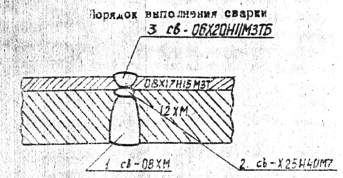 Выбор сварочных материалов определяется составом свариваемых сталей. Первым сваривается основной слой, вторым – планирующий. Этот порядок обусловлен требованием не подвергать повторному нагреву сварное соединение высоколегированной стали с целью обеспечения его высокой коррозионной стойкости и предупреждения образования хрупких мартенситных прослоек в зоне с плавления металла шва основного слоя с металлом шва планирующего слоя. С этой целью между швами основного и планирующего слоями иногда накладывают разделительные швы с большим запасом аустенитности. Например, при сварке стали 12ХМ + 08Х17Н15МЗТ первым сваривается слой из стали 12ХМ проволокой Св-08ХМ по флюсом АН-22, далее накладывается разделительный шов проволокой Св-Х25Н40М7 и, наконец, сваривается планирующий слой проволокой Св-06Х20Н11МЗТБ.