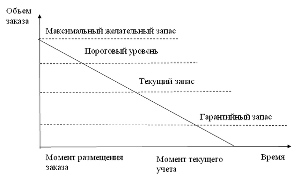 Текущий запас соответствует уровню запаса в любой момент учета. Он может совпасть с максимальным желательным запасом, пороговым уровнем или страховым запасом.