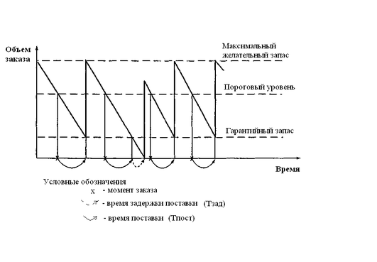 Таким образом, отличительной особенностью системы является деление заказов на две категории. Плановые заказы производятся через заданные интервалы времени. Возможны дополнительные заказы, если наличие запасов на складе доходит до порогового уровня. Очевидно, что необходимость дополнительных заказов может появиться только при отклонении темпов потребления от запланированных.